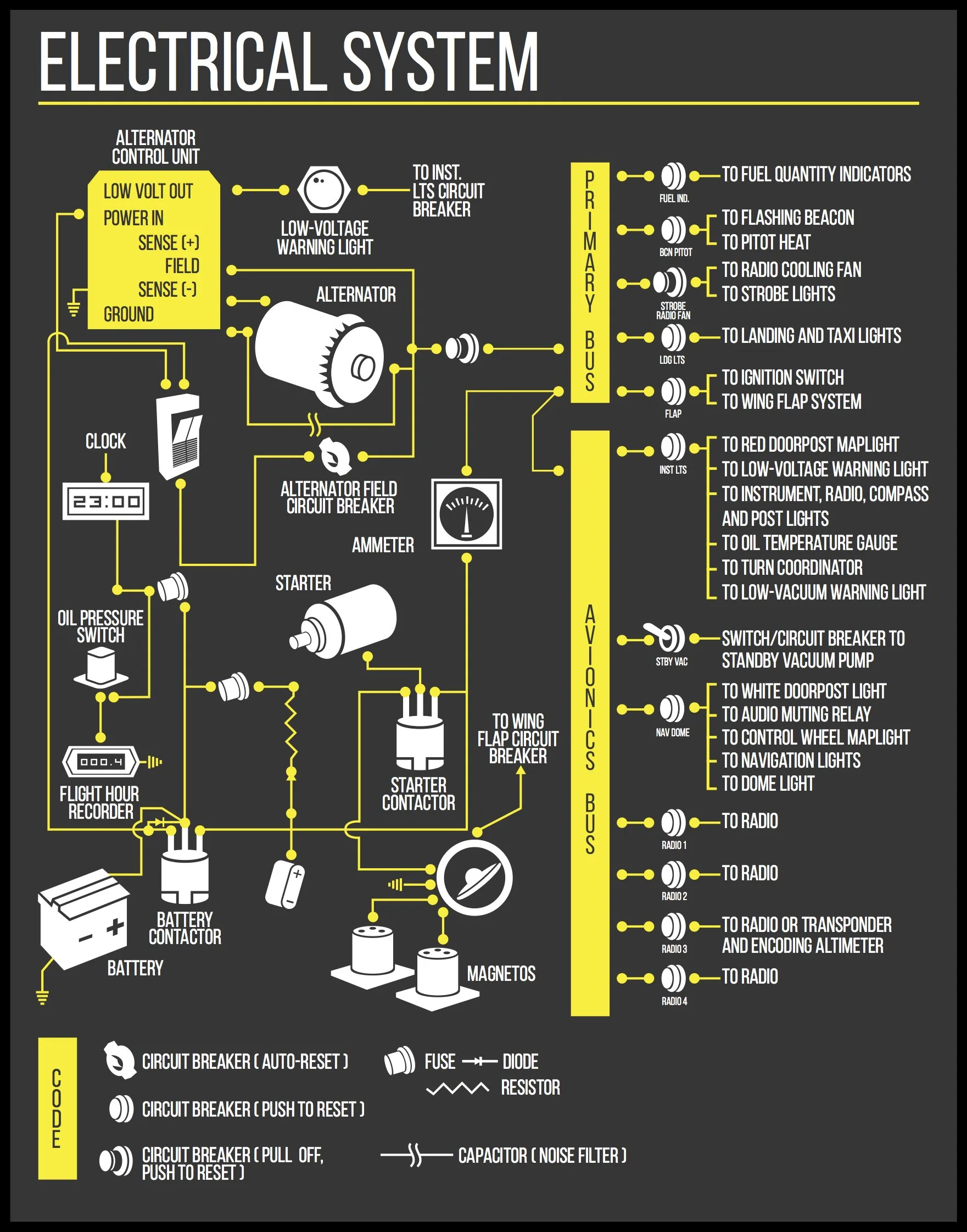 Most airplanes manufactured after 1990 have a 28-volt electrical system that powers all of the electrical components used in flight. A 24-volt battery supplies the electrical power to start the engine. Then an engine-driven alternator or generator takes over, powering all of the electrical components in the aircraft and recharging the battery with the additional 4-volts. Some older aircraft have a 14-volt electrical system that utilizes a 12-volt battery. Both generators and alternators convert rotational energy from the engine into electricity, but generators produce direct current (DC) and alternators produce alternating current (AC). Most of the electrical equipment in aircraft utilizes direct current, so power supplied by the alternator must be converted to DC. Alternators are the norm in piston engine aircraft because they produce more power for their size and weight and also produce more power at low RPMs. Nevertheless, operations at low RPMs may not generate enough current to power all of the electrical components and the battery can become depleted.